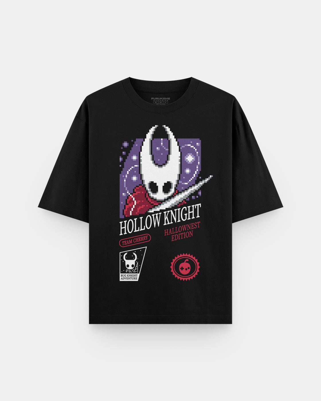 Diseño inspirado en el videojuego indie que conquistó a los fans con su atmósfera única y su arte detallado. Hechos con 100% Algodón y estampado en DTF, combinan suavidad, durabilidad y colores intensos que resaltan cada trazo del caballero y sus aventuras.